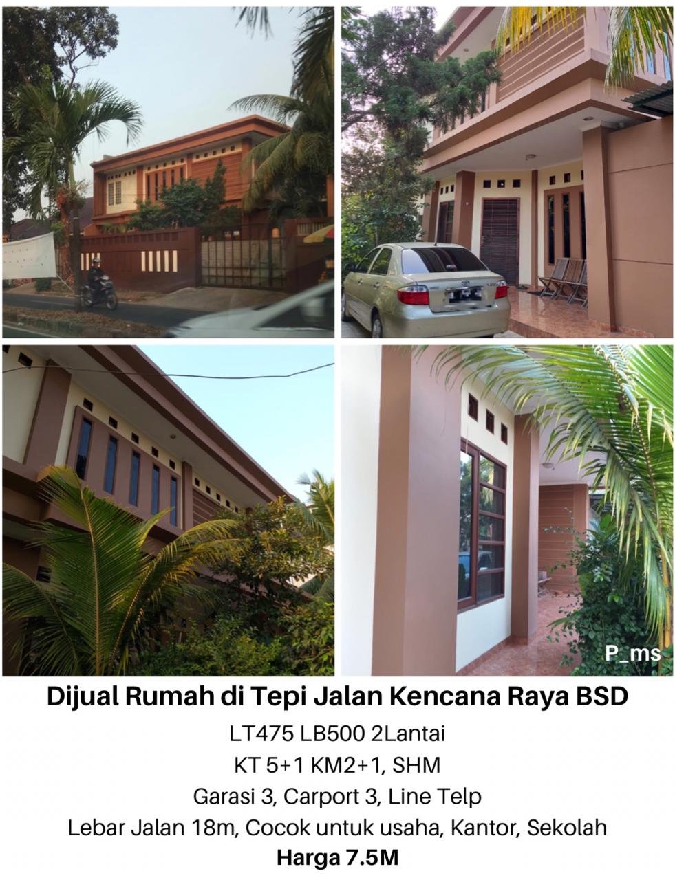 Dijual Rumah Di Tepi Jalan Kencana Raya BSDjalan lebar 18 m'bisa buat  usaha..kantor dan sekolah. , rumah dllluas tanah : 19x25 m2luas bngn : 500 m22 lantaigarasi utk 3 mblcarpark 3 mblkamar besar ada dua=      (4×8m2 & 4x9m2)kamar. lain =     (4x4m2 ,4×3m2,3×3m2)kamat pembantu 1 bhkamar mandi : 2 +1 shm,pam,pln.telp