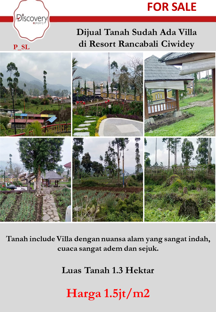 Dijual Tanah Sudah Ada Villa di Resort Rancabali CiwideyLebar Muka 17m2Luas Tanah 1.3 Hektar (13000 m2)Harga 1.5jt/m2