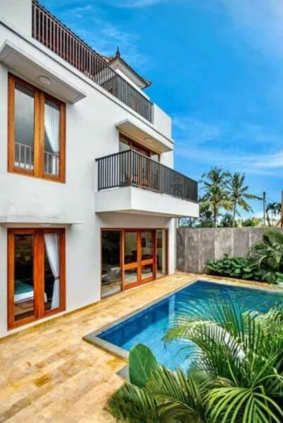 Villa yang didesain modern dengan 3 kamar tidur ini terdiri dari 3 lantai dengan roof top yang memiliki view menakjubkan ke hamparan sawah, hutan, dan pegunungan.