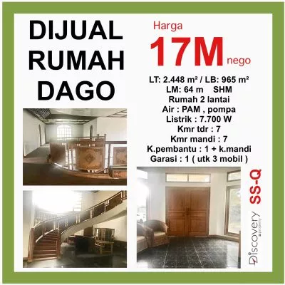 Dijual Rumah Luas di Dago Atas, Cocok untuk Kompleks atau Hunian KeluargaLokasi strategis di kawasan sejuk dan prestisius Dago Atas, Bandung. Properti dengan luas tanah 2.448 m² dan luas bangunan 965 m² ini memiliki potensi besar untuk dibangun menjadi kompleks kecil atau beberapa rumah untuk keluarga kecil. Memiliki lebar muka 64 meter, rumah ini juga sangat cocok untuk investasi properti.Spesifikasi:Sertifikat Hak Milik (SHM)2 lantai7+1 kamar tidur, 7+1 kamar mandiGarasi untuk 3 mobilSumber air: PAM dan pompaDaya listrik: 7.700 wattHarga: Rp 17 MiliarDengan akses mudah ke berbagai fasilitas umum dan pemandangan indah, rumah ini menawarkan kenyamanan dan privasi. Jangan lewatkan kesempatan memiliki properti dengan lokasi eksklusif di Dago Atas yang juga ideal untuk investasi jangka panjang!Hubungi: 0899-6633-889 (WhatsApp)Instagram: @hengky.discoveryYouTube: @propertique_idTikTok: @PropertiqueHashtag: #RumahDago #PropertiBandung #RumahSecondary #RumahLuas #DagoAtas #InvestasiProperti #RumahDijual #PropertiEksklusif #RumahBandung #HunianNyaman #RealEstate